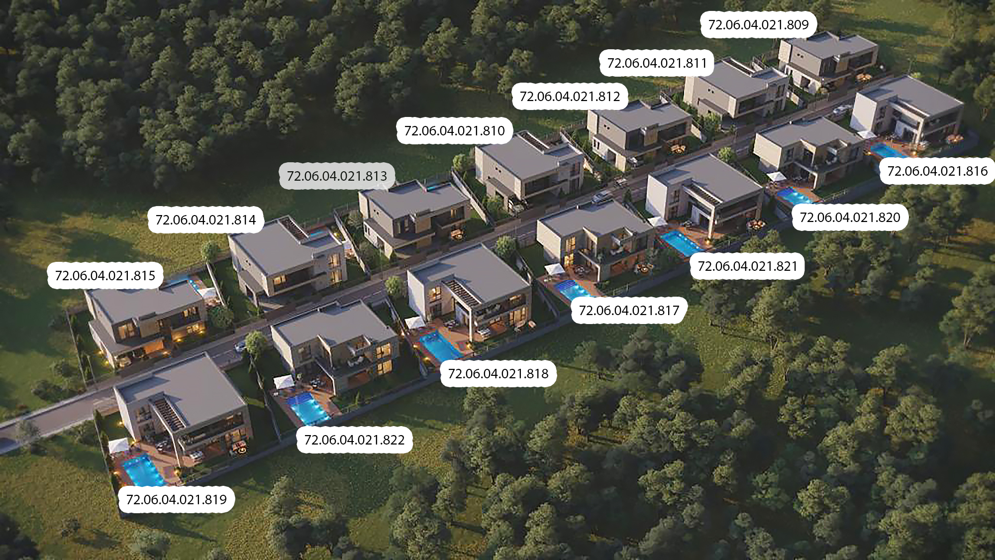 The project consists of a 9,000 m2 plot divided in 14 plots of areas between 543 and 560 m2.